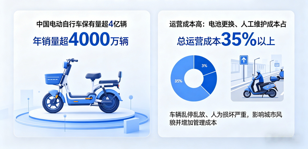 我国电动自行车保有量超4亿辆,年销量超4000万辆,是市民短途出行的首选工具。但传统模式长期存在的顽疾,已成为行业发展与城市治理的阻碍: